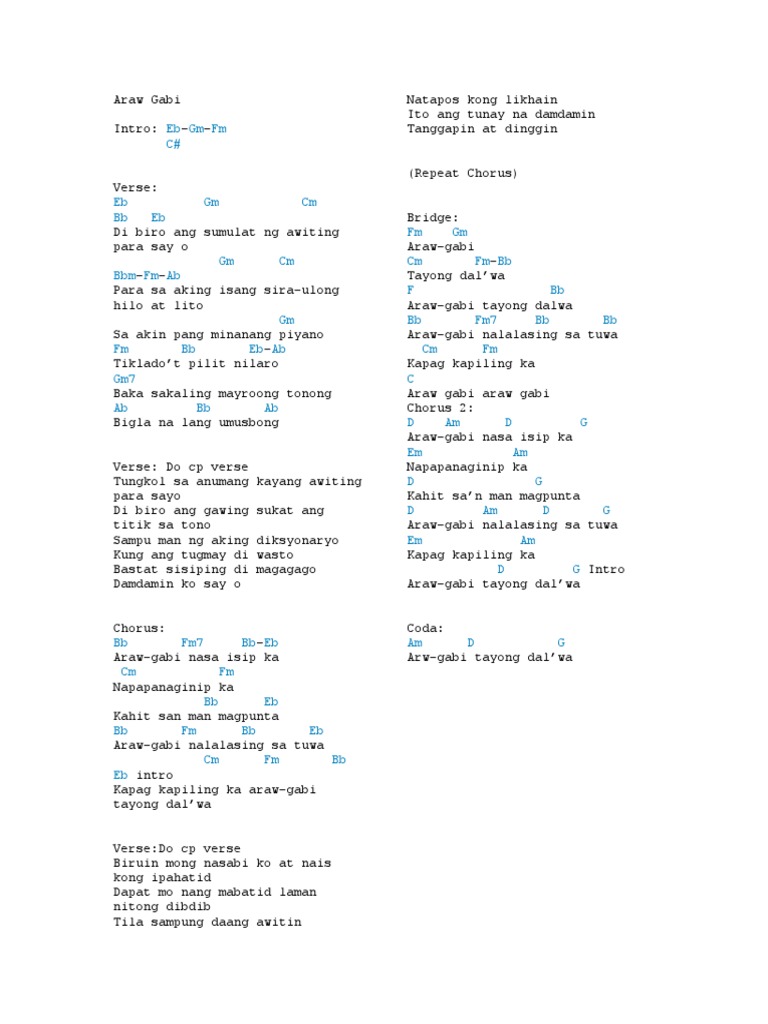 Type song title artist or lyrics. Araw-Gabi Di biro ang sumulat ng awitin para sayo Para akong isang sirang ulo hilo at lito Sa akin pang minanang piyano Tikladoy pilit nilaro Baka sakaling merong tono. Comment and share your favourite lyrics.