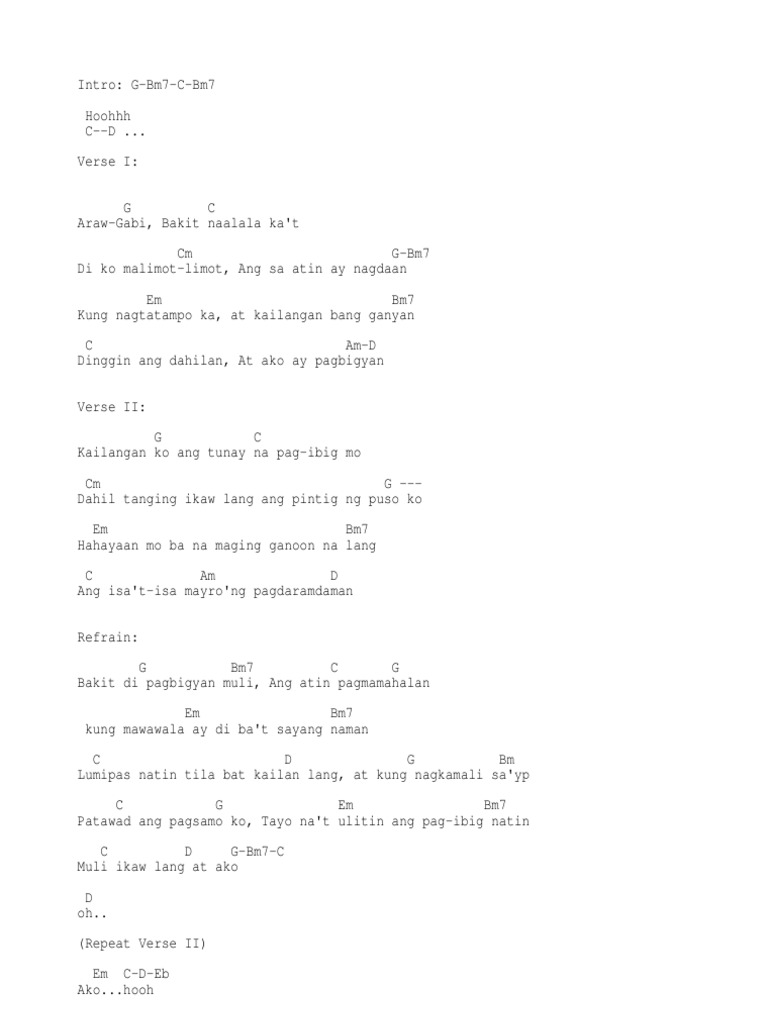 239 A AAA A F F G A G F DC Sa mahabang gabi tumigil ang mundo C C D F F F AGFGF Sa pag-asang dala Mo F A A F AGFG Tuloy ang pasko C F F C F F F C. Pag-ibig na nadarama ay para lang sayo Sanay ikaw na ang aking pag-ibig Ikaw na sa bawat saglit At lagi ay kapiling ko kahit sa panaginip Pag-ibig na inaalay sayo Sana namay pagbigyan mo Pagkat ikay nag-iisa dito sa puso ko Araw-gabi naiisip kita Palagi kang naroroon dahil mahal kita Ang iyong ngiti hanap ko sa tuwina. Chords ratings diagrams and lyrics.